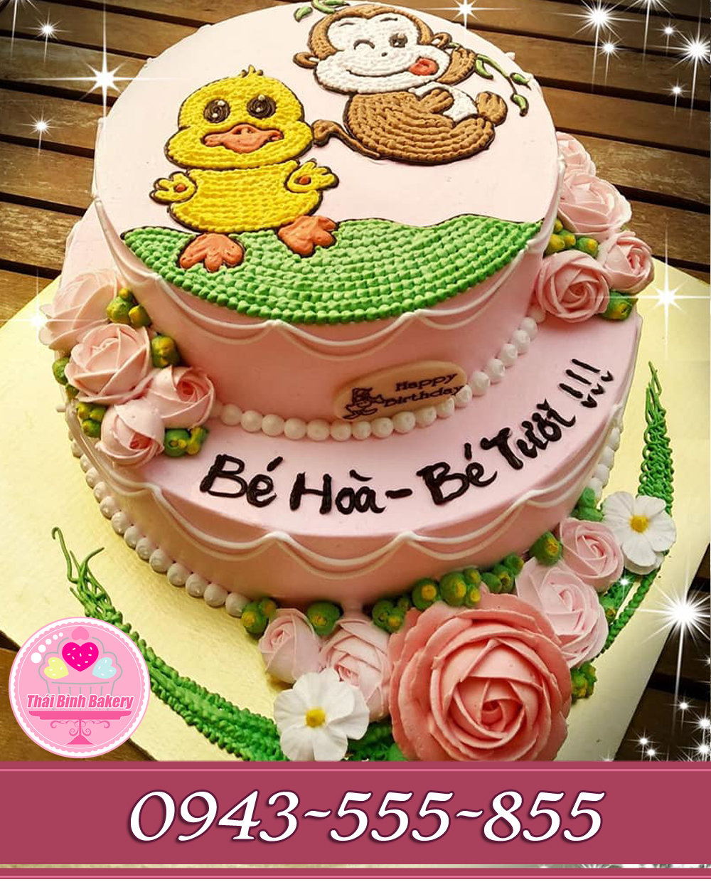 Đánh Giá: Bánh kem 2 tầng vẽ nhân vật khỉ và vịt